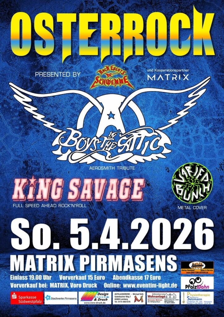 Gemeinsam mit dem Headliner BOYS IN THE ATTIC (Aerosmith Tribute) und VARIED BUNCH (Hard´n Heavy Covers) dürfen wir die MaTriX in Pirmasens ab ca. 20 Uhr kräftig durchrütteln.
